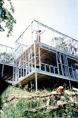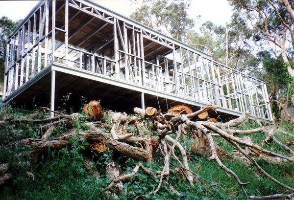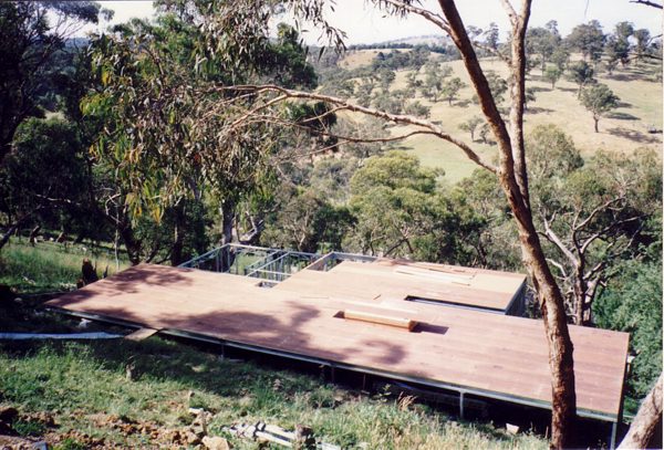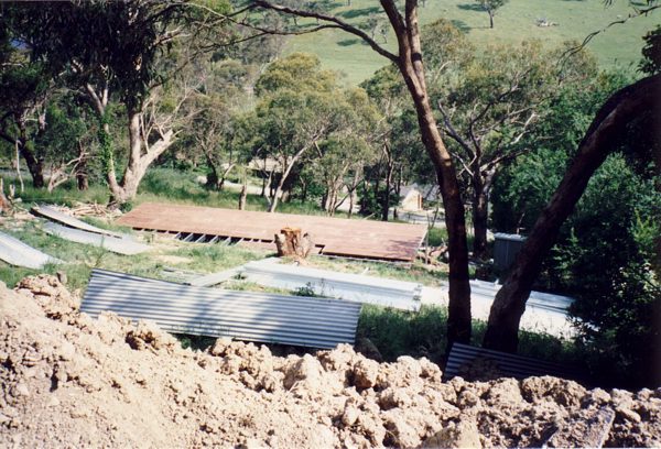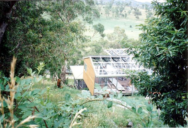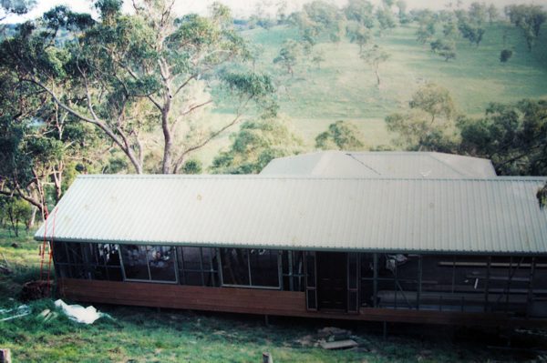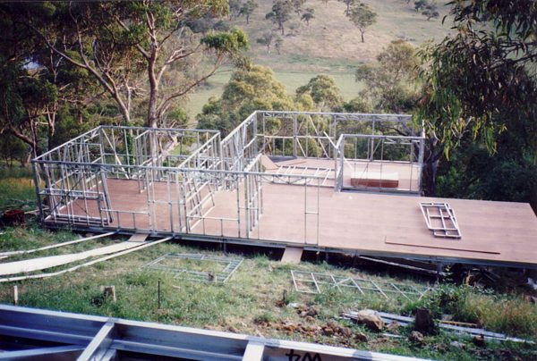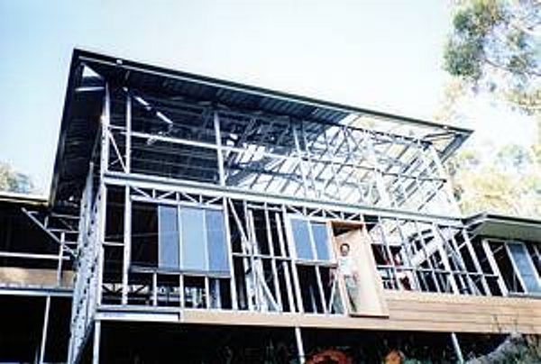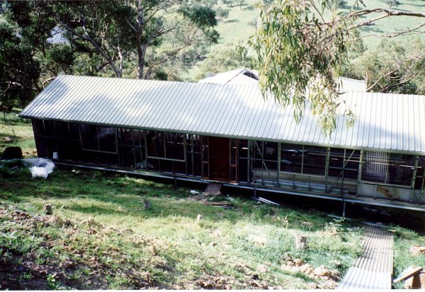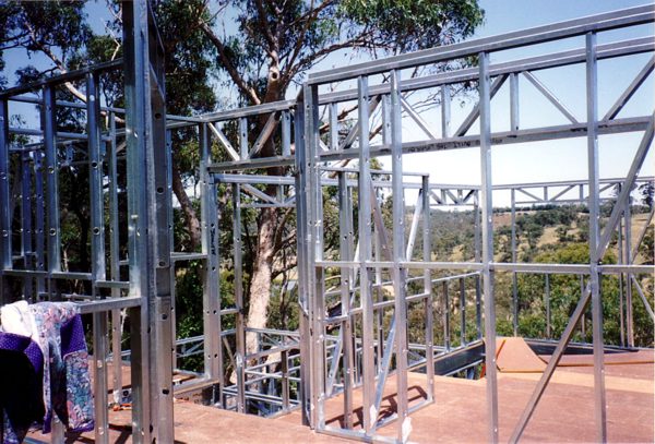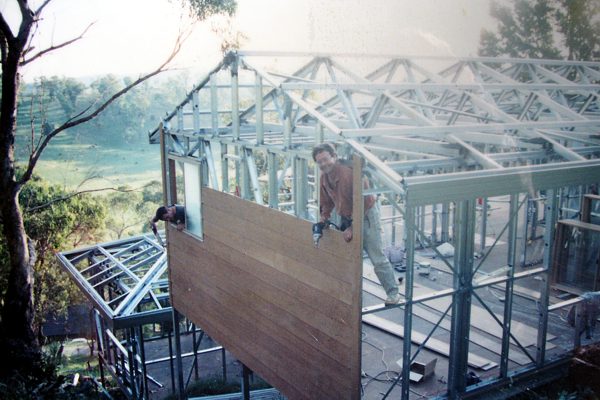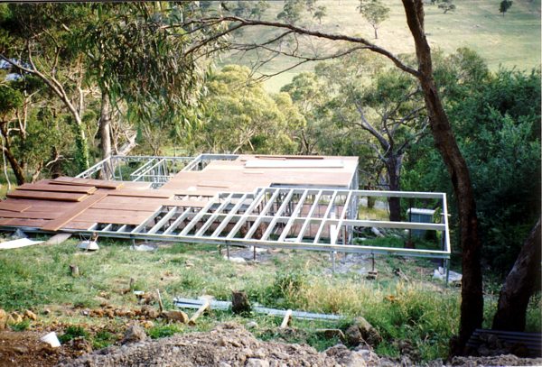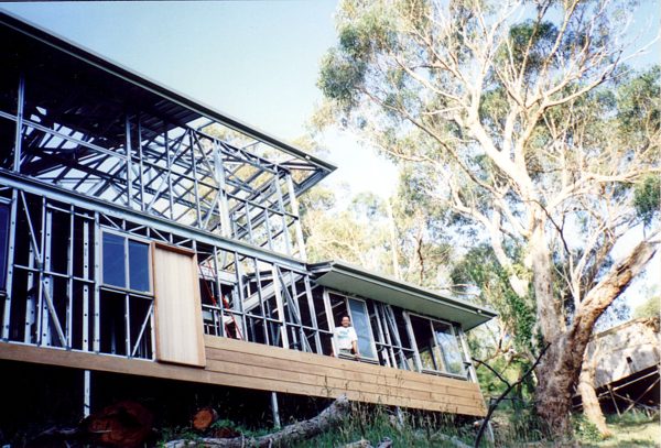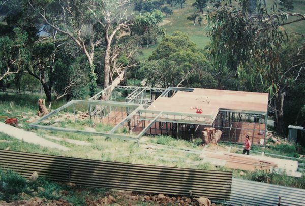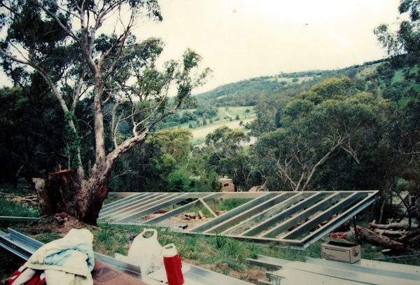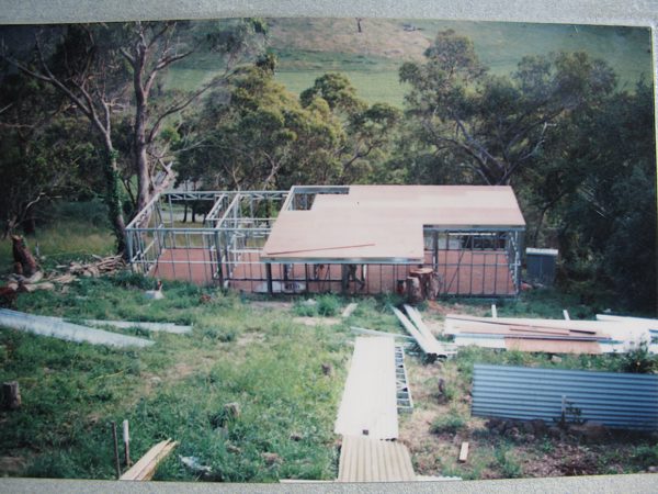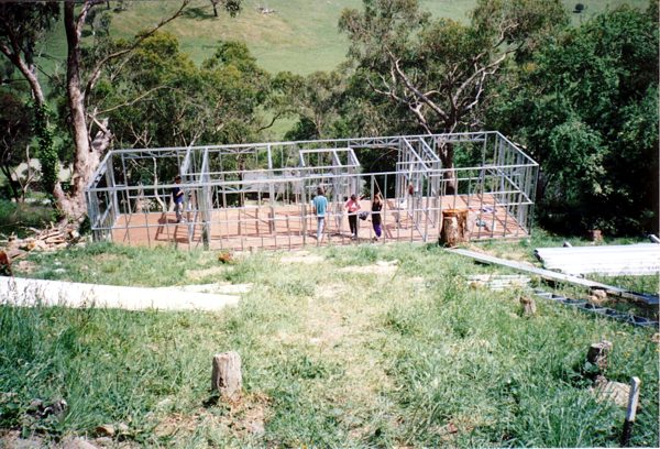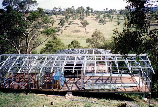 The house is built with a steel frame and an exterior of wood-grained cement sheet which helps a lot in this bushfire-prine area. We did all of the work ourselves, except for the electrical wiring and essential plumbing. We built the house on weekends and in trhe evenings while both working full time and while David did his PhD. We love our steel-framed house.