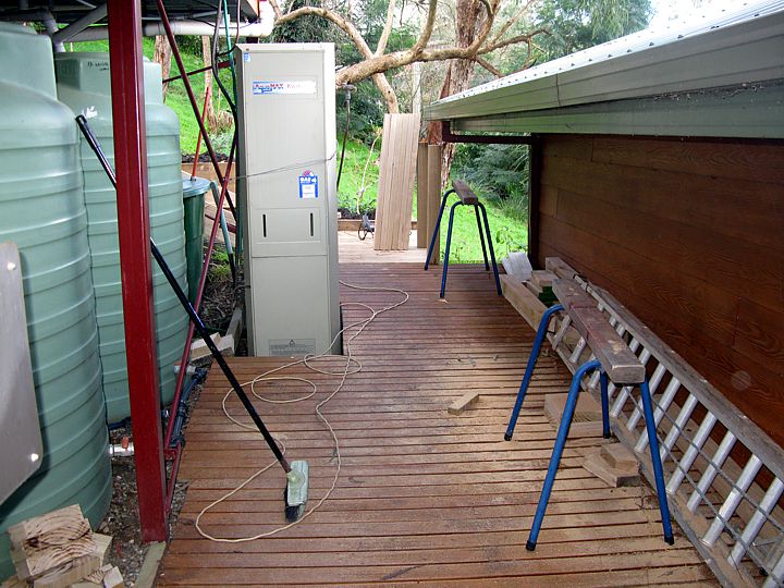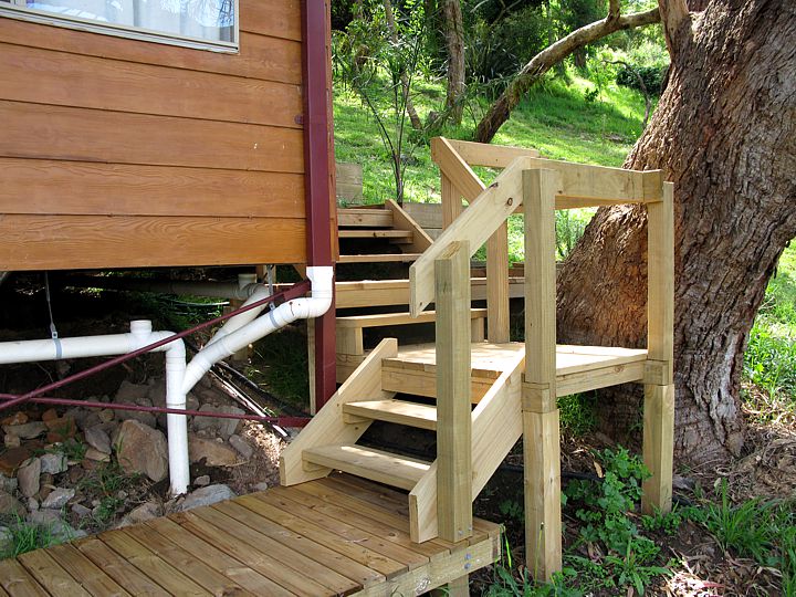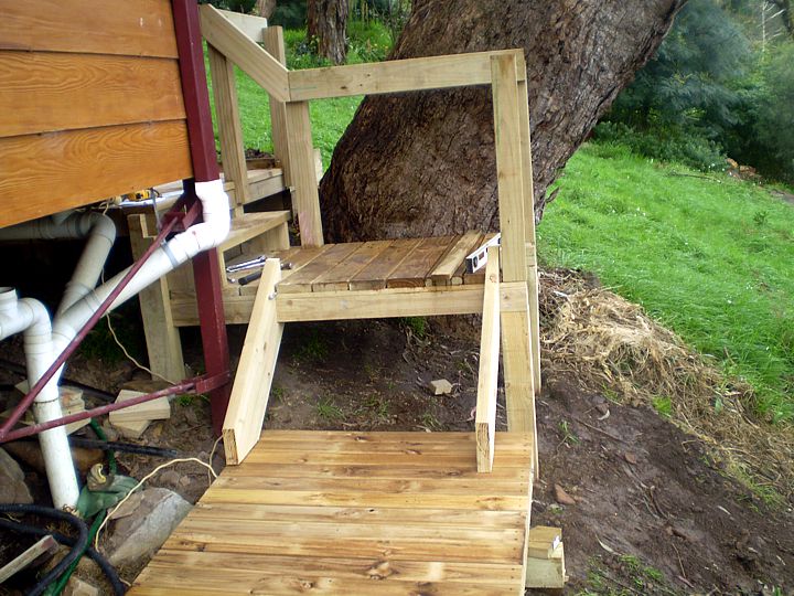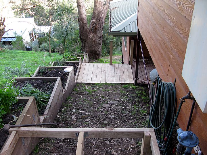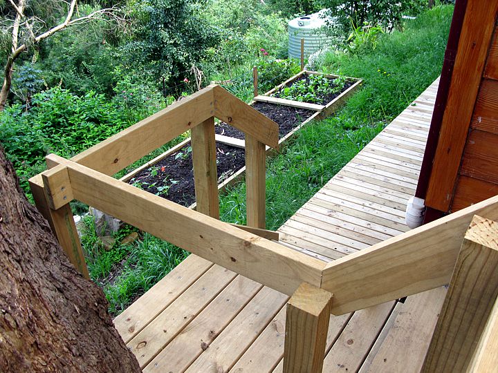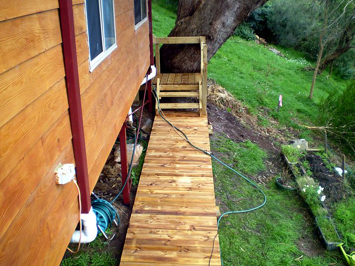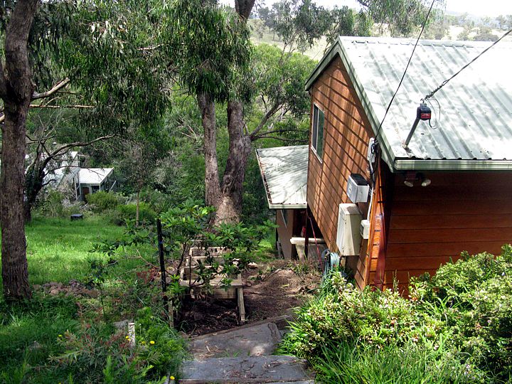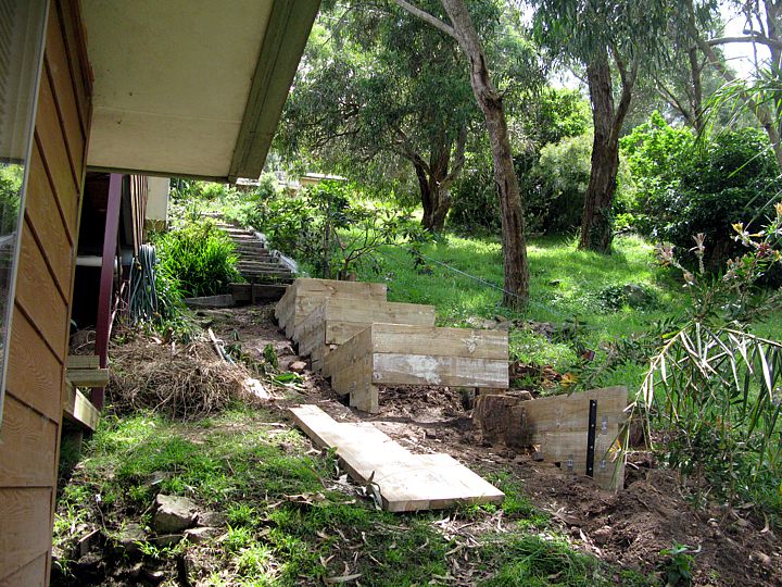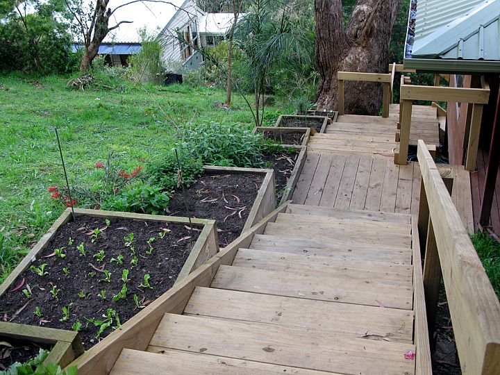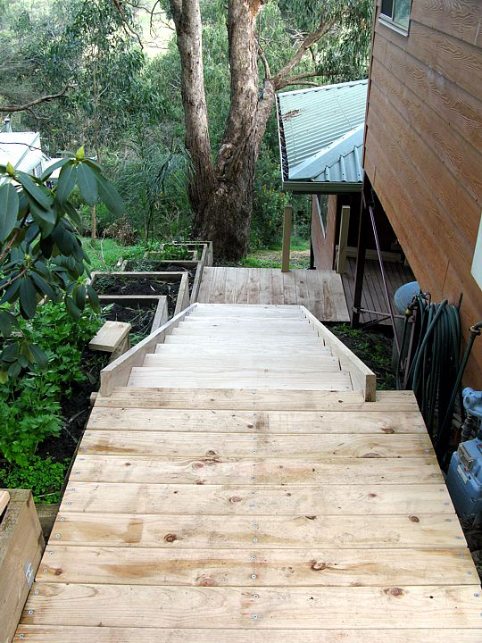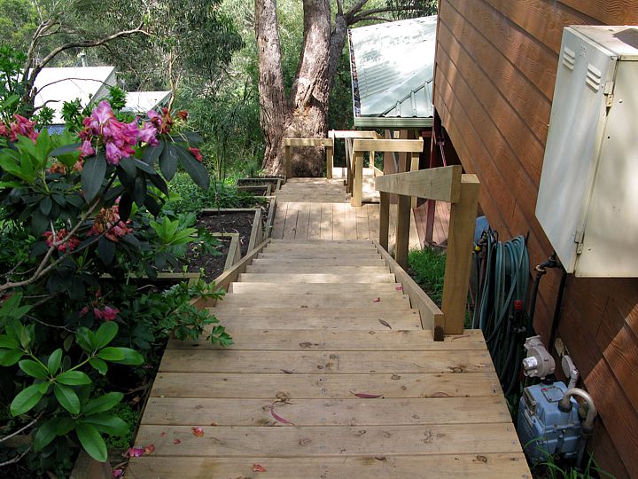 The east side of the property is the suniest and therefore has the best aspect for gardens. This side is often traversed to access the heater and hot water system, which sometimes needs relighting if their pilots blow out in strong winds. It is steep and slippery in the wet and so a combined terraced system of garden beds, and stairs ad ramps to provide access between the top level the middle level and lower level, and then across to the back door, was important. furthermore, the design featured multiple short decks on the lower section so that a ladder could be used in multiple places to assist in clean the roof on the lowest level. This roof collects the most crap as its right under a giant Eucalypt which drops a tom of leaves, branches and sap onto the roof.